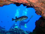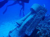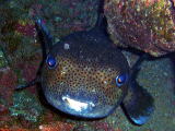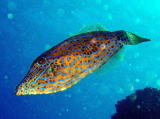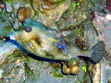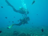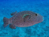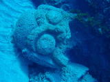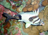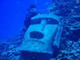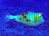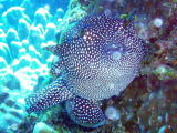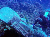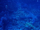 | 手前が白いハリセンボンで奥が白いヒメジ。白砂にいるから白いの? | 白いハリセンボン。もっと近づきたかったんだけど…。 | セスナ機の残骸。それほど魚は群れてません。 | 沈船。魚もいないし、人も入れない。 |