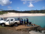 | ダイビング・ショップのロゴ。「7/7」は、「休業日無し」の意味。 | ショップの送迎車。乗り心地はチョイだけど、エアコンが付いてるぅー♪ | ダイビング・ショップ。狭いトコにいつも人がワイワイ・ガヤガヤしてる。 | ポイントは南の方へ行ったトコ。ホテル・メリディアンの近く。 |